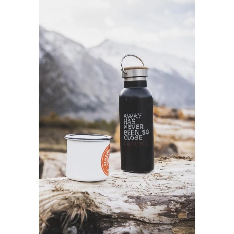 >, l’aventure est au détour du chemin, cette phrase décore la magnifique bouteille thermos en acier inoxydable NUNATHERM 0,75 L pour vous inspirer au quotidien
