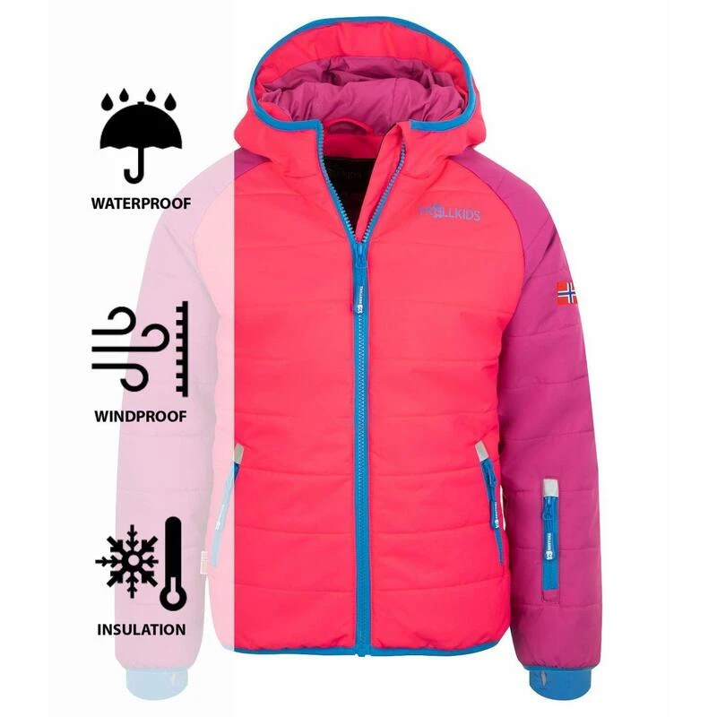 Veste est légère, coupe-vent et déperlante avec un rembourrage en polyfibres facile d’entretien. La jupe pare-neige et les fermetures velcro sur les bras tiennent la neige à distance.